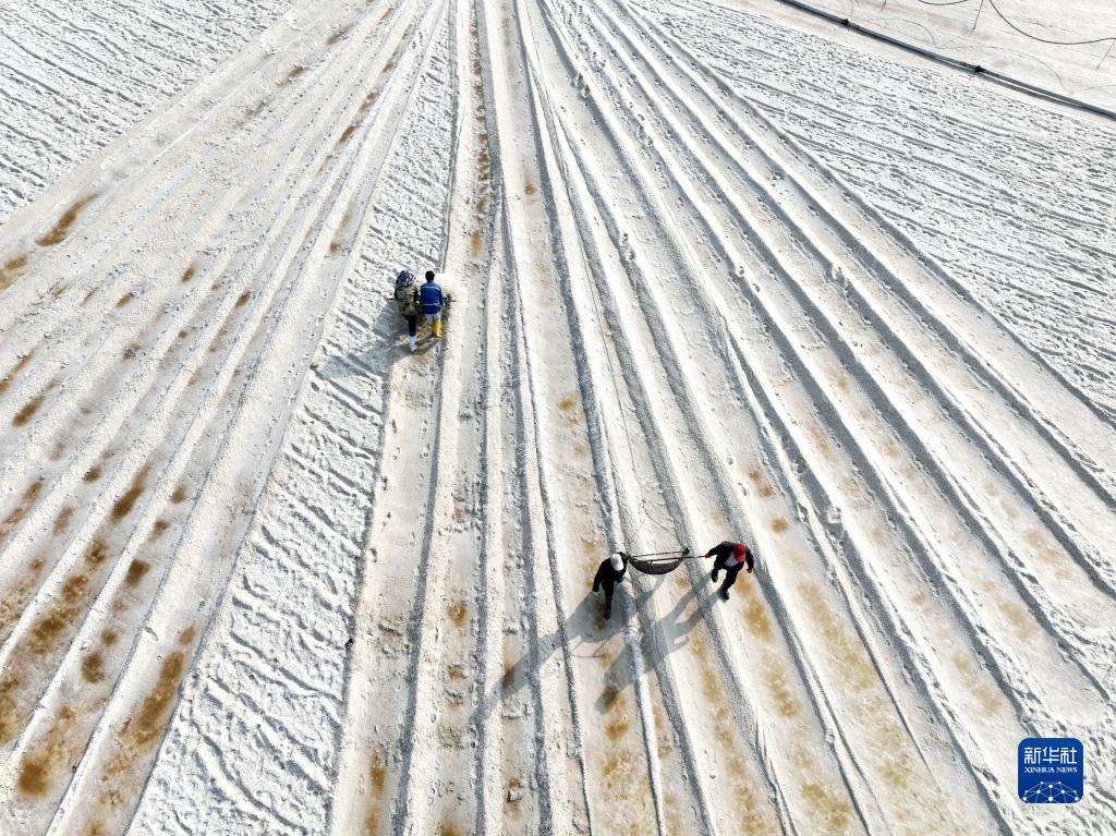 3月28日,在江蘇省連云港市大浦鹽田,工人在鹽田里進行“春扒”作業(無人機照片)。