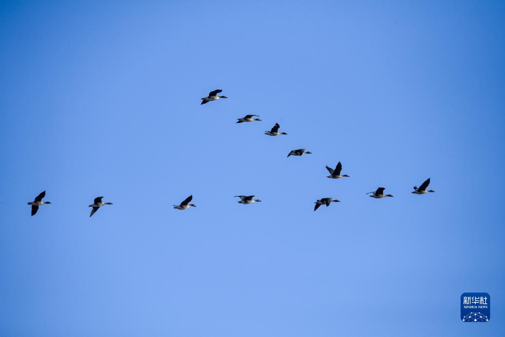 3月28日,在吉林省白城市鎮賚縣,一群豆雁從濕地上空飛過。