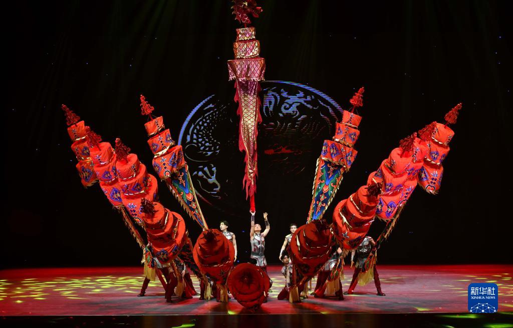 3月28日,在位于山東省濟南市的山東省會大劇院,演員表演雜技節目《龍躍神州·中幡》。