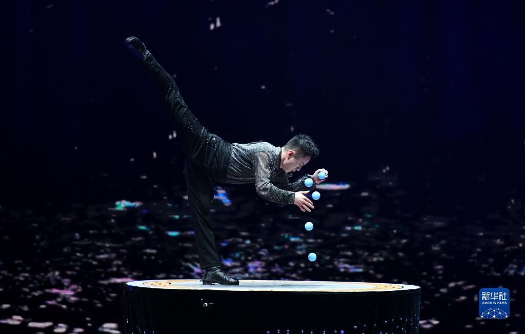 3月28日,在位于山東省濟南市的山東省會大劇院,演員表演雜技節目《雨中狂想·球技》。