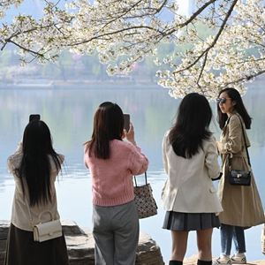 3月29日,游客在北京玉淵潭公園觀賞盛開的櫻花。
