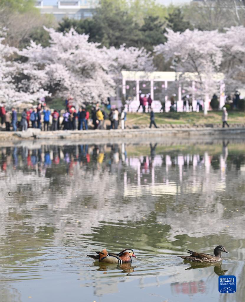 3月29日,北京玉淵潭公園櫻花盛開,鴛鴦嬉戲。
