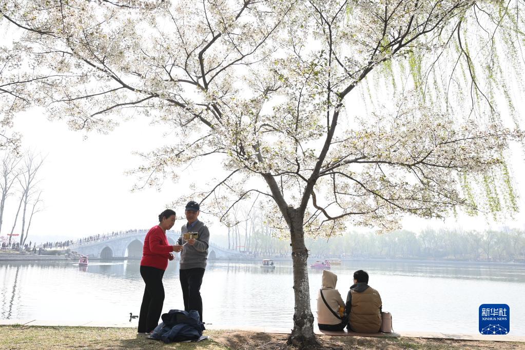 3月29日,游客在北京玉淵潭公園觀賞盛開的櫻花。