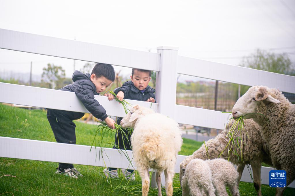 3月29日,小游客在諸暨市楓橋鎮杜黃新村的農耕體驗研學基地喂羊。