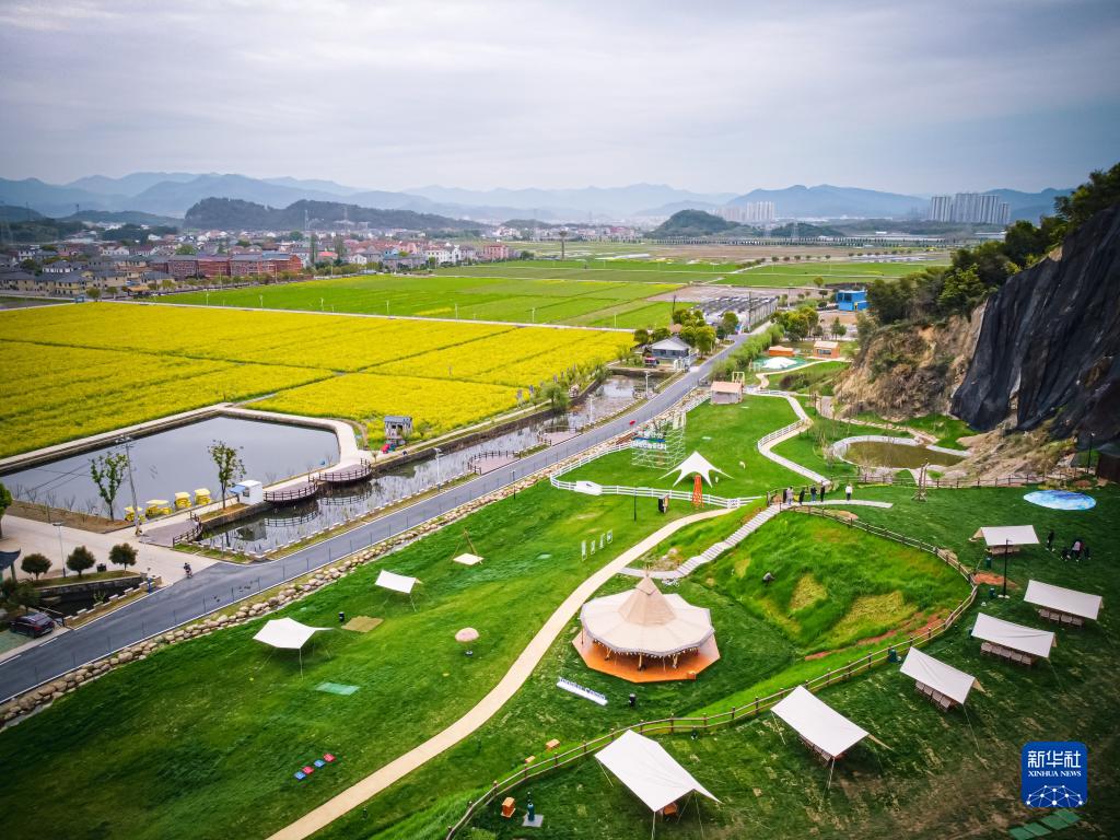 這是3月29日拍攝的諸暨市楓橋鎮杜黃新村用廢棄礦山改造的露營旅游地(無人機照片)。