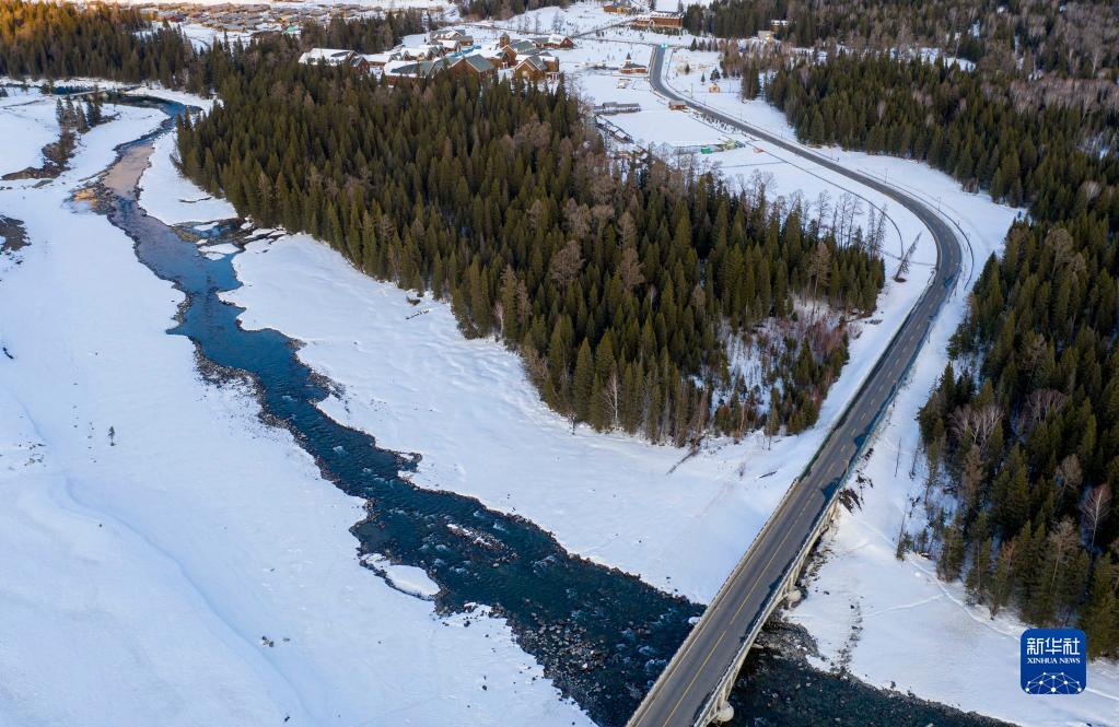 3月28日拍攝的跨過喀納斯河的G219國道(無人機照片)。