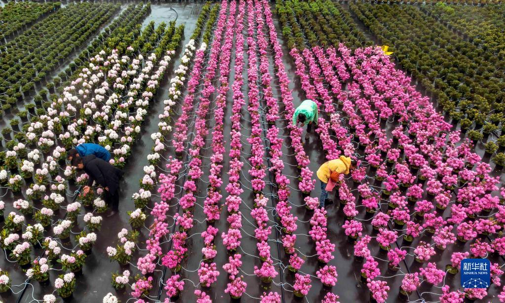 3月28日,農民在貴州省畢節市百里杜鵑管理區匯境花卉基地修剪花枝(無人機照片)。