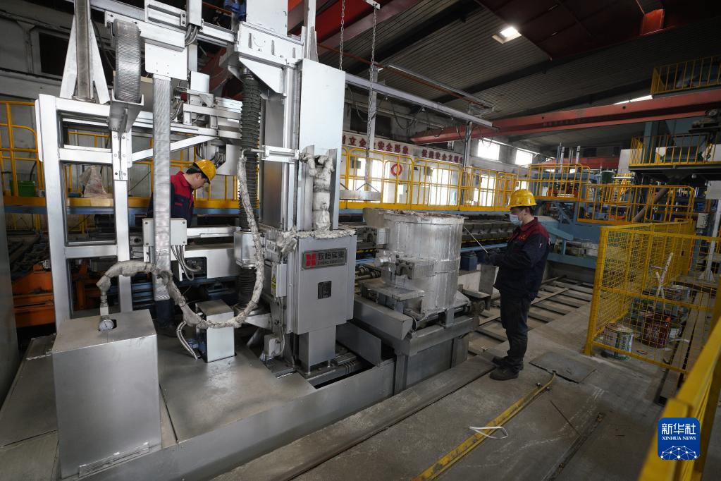 3月29日,在滄州渤海新區黃驊市榮泰模具科技股份有限公司生產車間,工人調試全自動智能鑄造生產線。