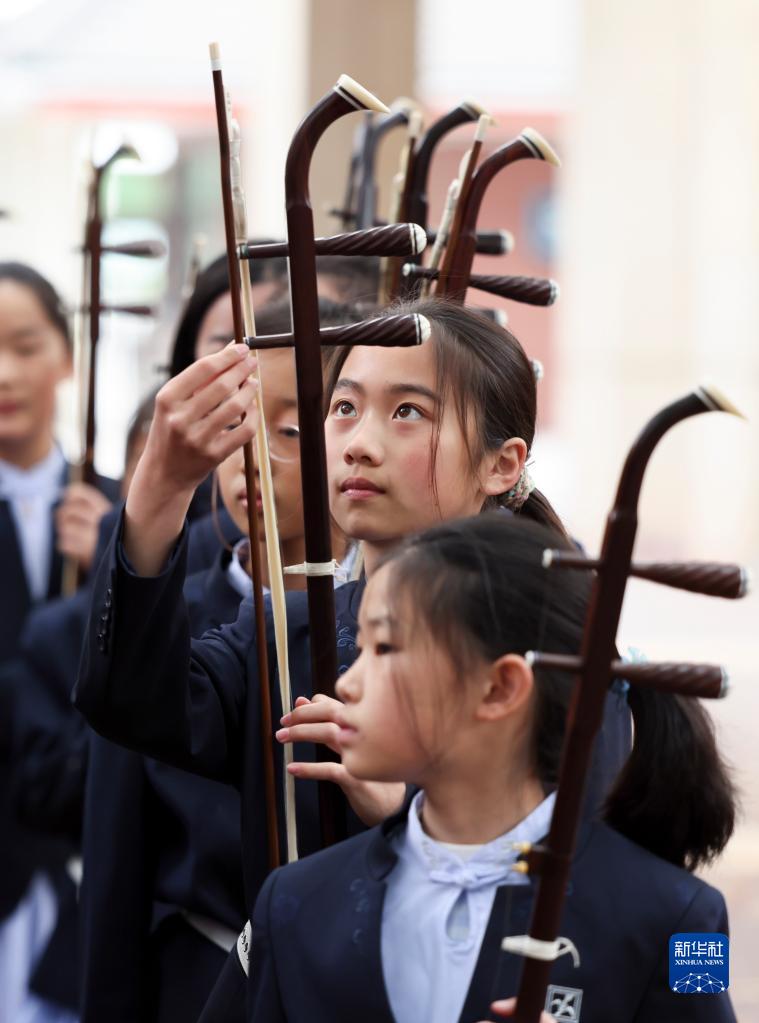 3月29日,江蘇無錫梅村實驗小學學生在課前調試二胡。