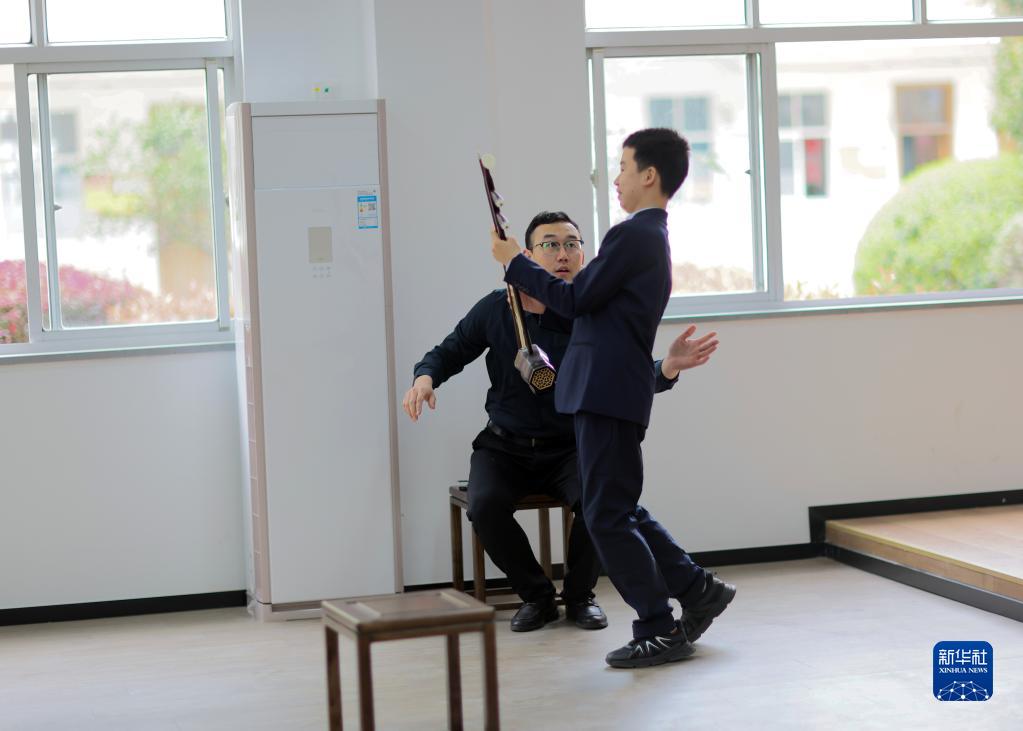 3月29日,在江蘇無錫梅村實驗小學,二胡老師紀海軍在鼓勵學生陳宇豪。