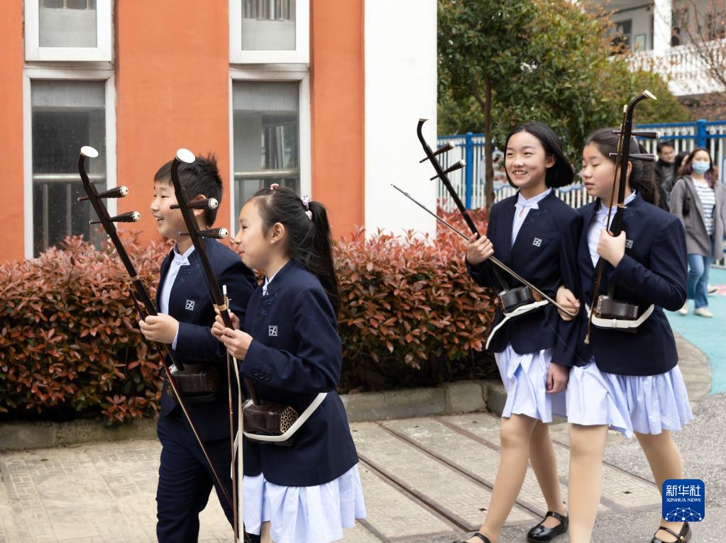 3月29日,江蘇無錫梅村實驗小學學生準備去上二胡課。