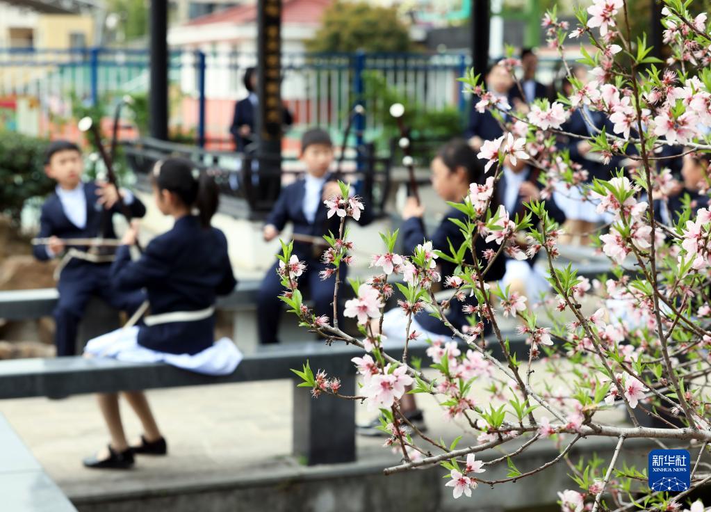 3月29日,江蘇無錫梅村實驗小學二胡社團學生在戶外演奏。