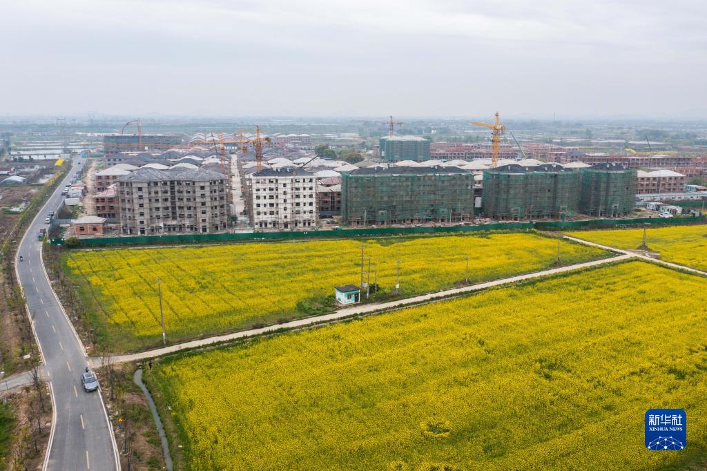3月29日拍攝的浙江省湖州市東林鎮星群村經過土地綜合整治后建成的高標準農田和正在建設的農民新村(無人機照片)。