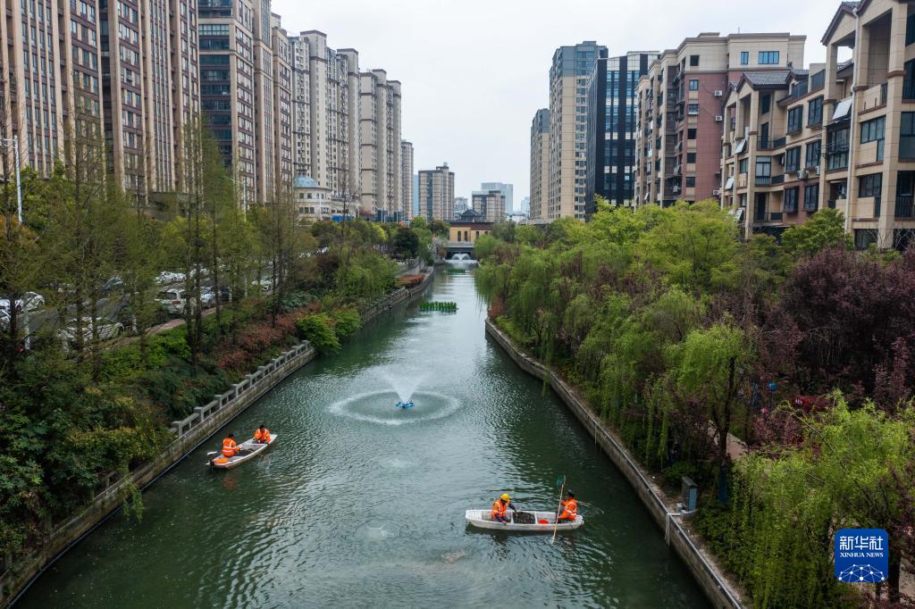3月29日,龍泉街道工作人員乘船在市陌河里投放螺螄,改善水質(無人機照片)。
