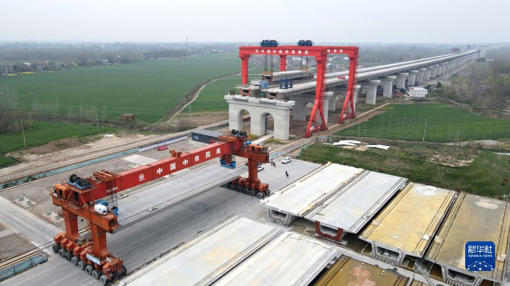 這是3月29日拍攝的中鐵四局巢馬城際鐵路箱梁架設現場(無人機照片)。