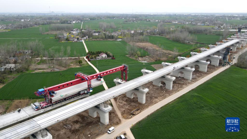 這是3月29日拍攝的中鐵四局巢馬城際鐵路箱梁架設現場(無人機照片)。