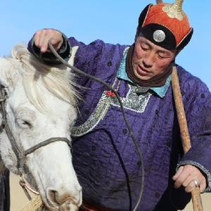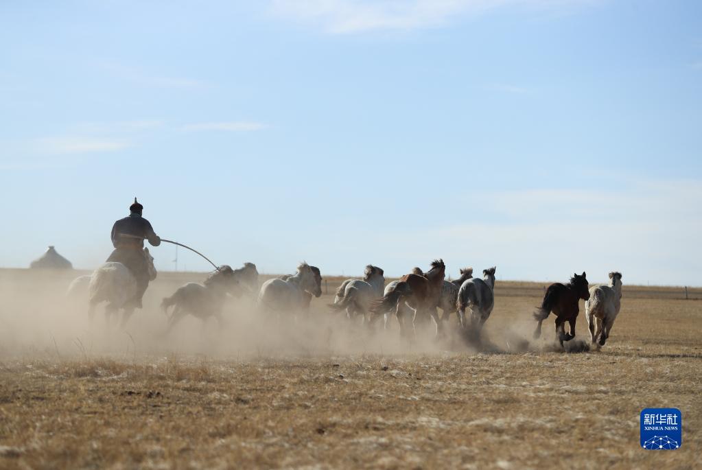 春日到來,內蒙古錫林郭勒盟西烏珠穆沁旗天氣轉暖,當地牧民趕著馬匹,來到草原上馴馬。