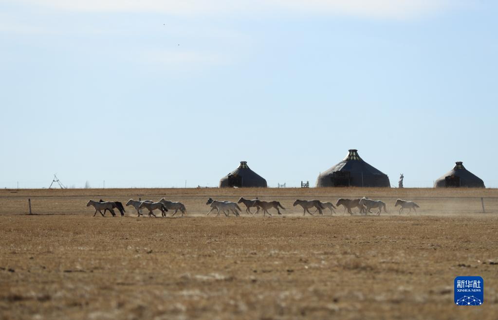 春日到來,內蒙古錫林郭勒盟西烏珠穆沁旗天氣轉暖,當地牧民趕著馬匹,來到草原上馴馬。