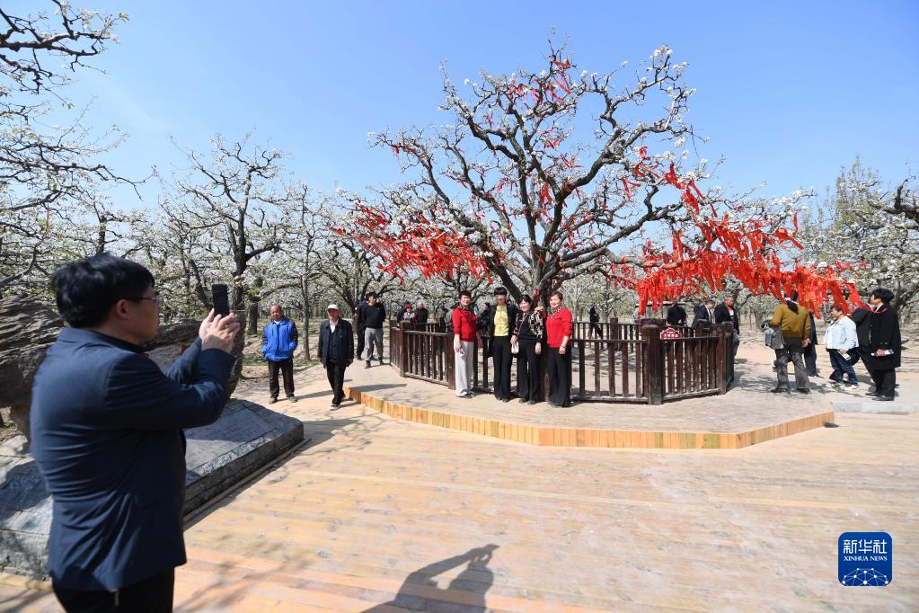 3月29日,游客在寧陵縣萬畝梨園景區的“梨樹王”邊拍照留念。