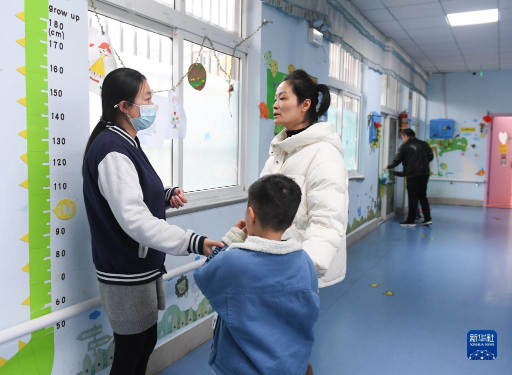 3月29日,一名家長(左三)在課后向老師了解孩子的狀況。