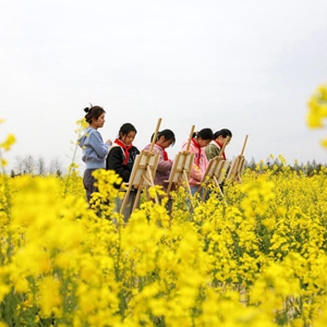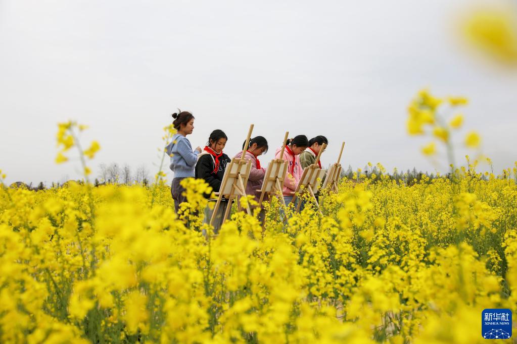 3月29日,學生在來安縣大英鎮一生態農莊內的油菜花海中寫生。