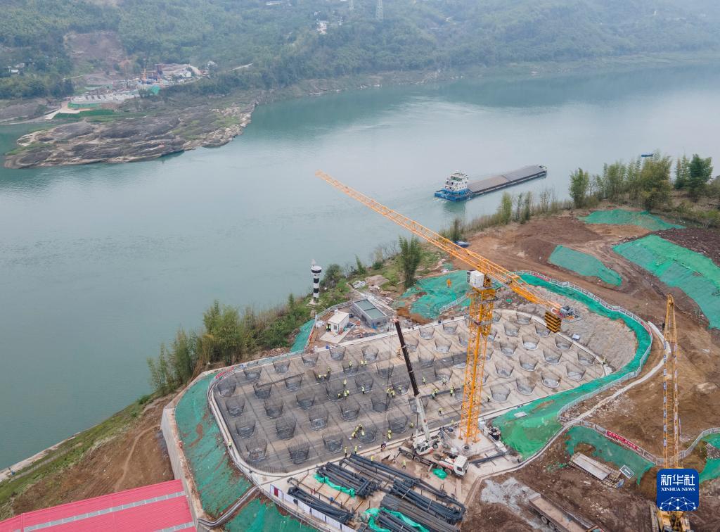 這是在重慶市涪陵區拍攝的石沱長江大橋北岸主塔的施工現場(3月29日攝,無人機照片)。