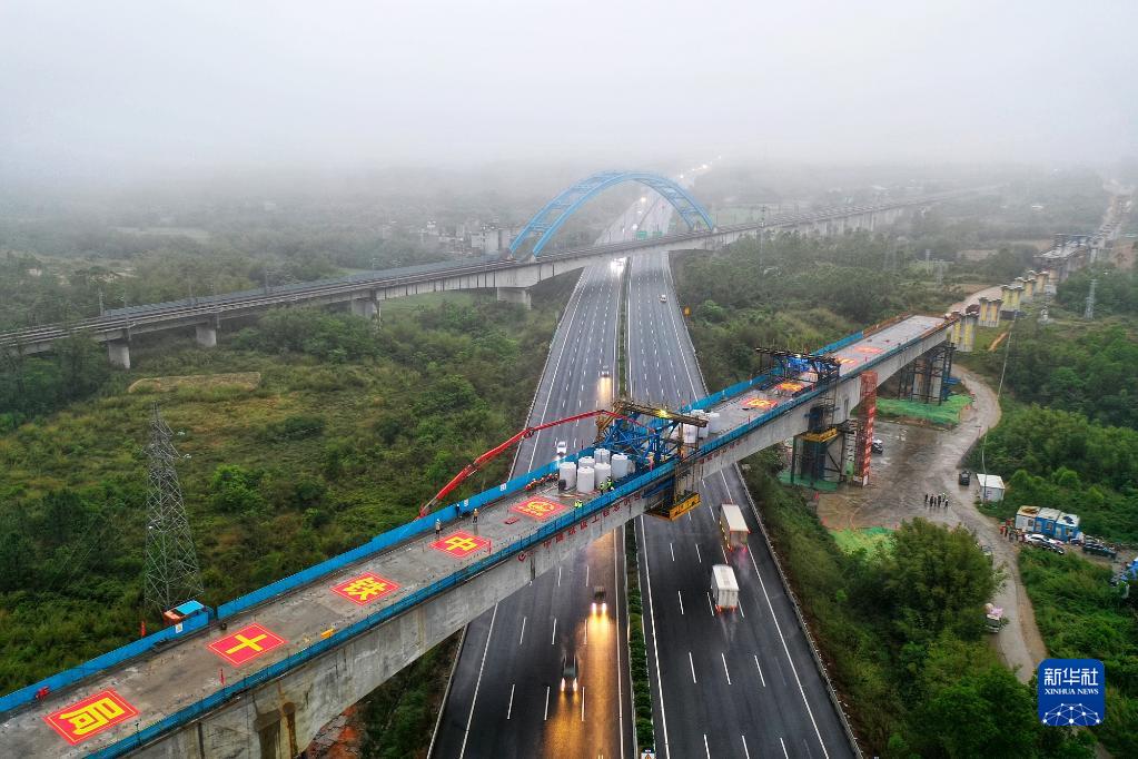 這是廣湛鐵路長興村特大橋跨沈海高速連續梁合龍段施工現場(3月29日攝,無人機照片)。