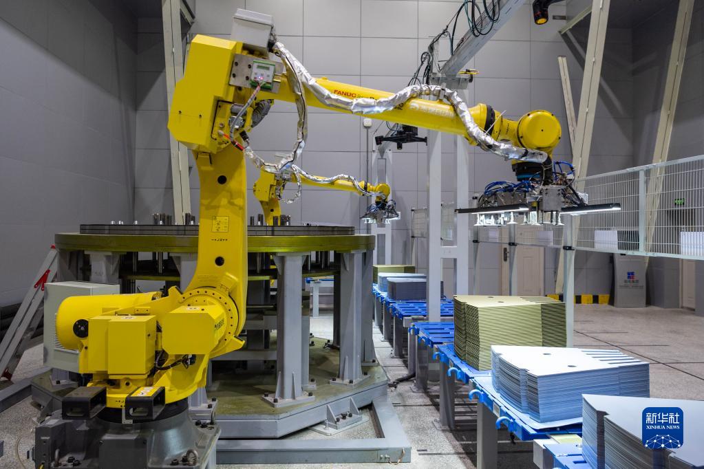 3月29日,在哈電集團哈爾濱電機廠有限責任公司的生產車間,智能疊片機器人在進行自動化作業。
