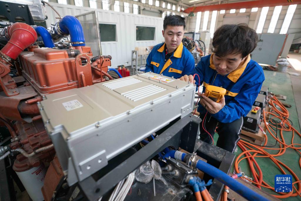 3月29日,在河北滄州渤海新區黃驊市北京交通大學黃驊軌道交通綜合研發實驗基地,來自北京交通大學的博士生團隊進行混合動力系統試驗。