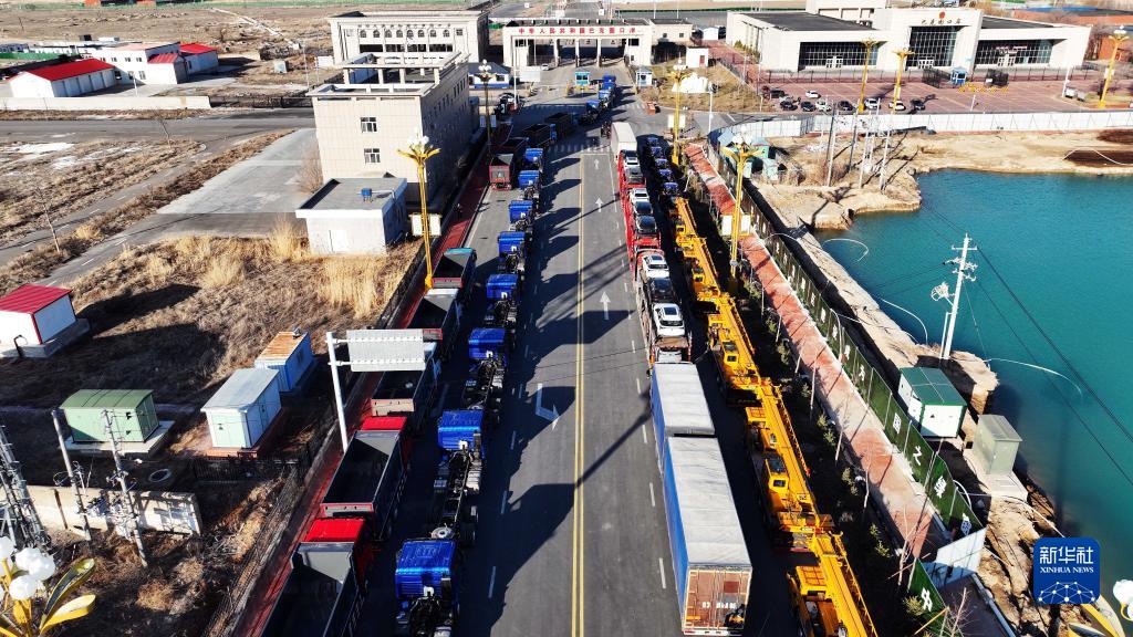 3月29日,來自哈薩克斯坦的貨車和即將出口的車輛在巴克圖口岸執勤民警引導下有序出境(無人機照片)。