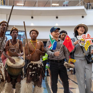 3月29日,在南非約翰內斯堡坦博國際機場舉行的歡迎儀式上,舞蹈演員與中國游客互動。
