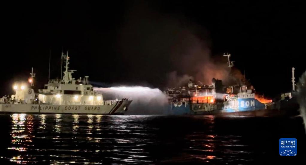 3月30日,在菲律賓南部巴西蘭省附近海域,菲律賓海岸警衛隊船只向起火的渡輪實施滅火救援。