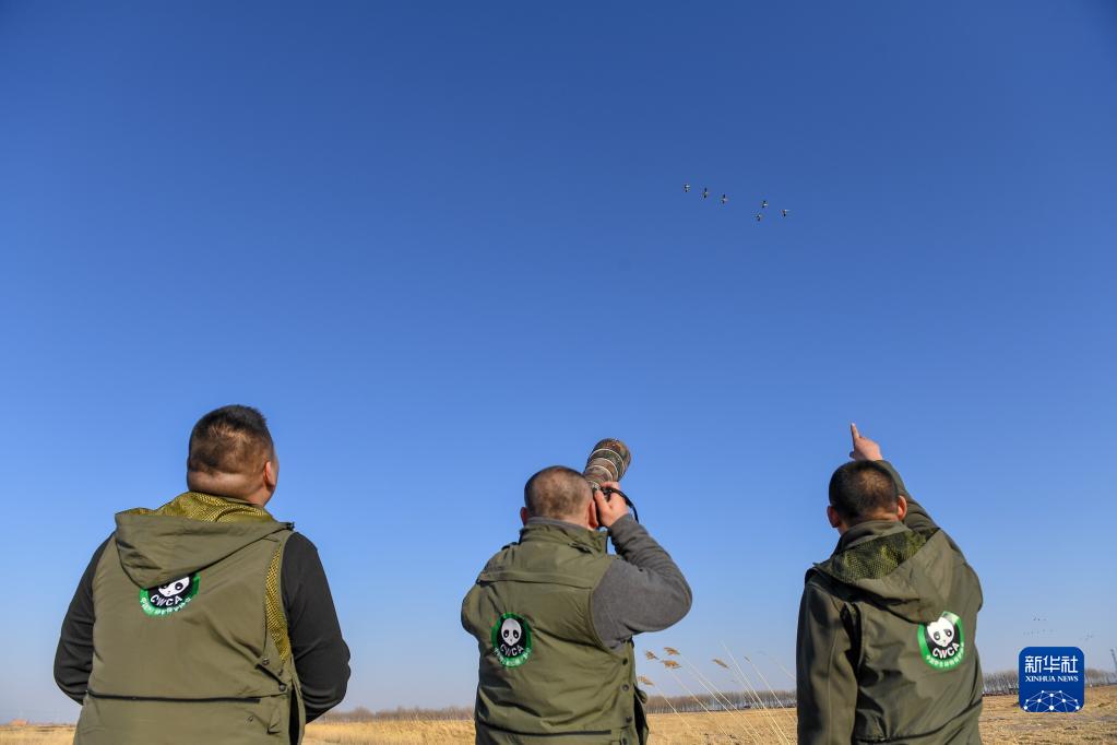 3月28日,在吉林省白城市鎮賚縣濕地,中國野生動物保護協會吉林白城護飛隊隊員王凱(右)、姜海濤(中)和劉聰觀察、拍攝候鳥遷徙。