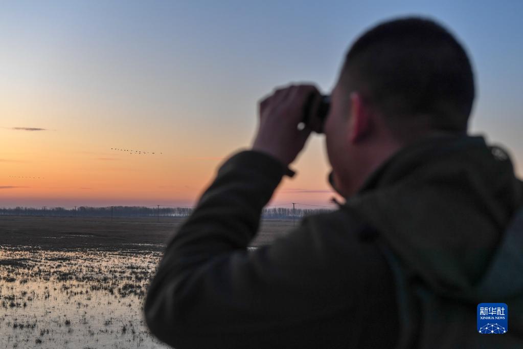 3月29日,在吉林省白城市鎮賚縣濕地,中國野生動物保護協會吉林白城護飛隊隊員王凱觀察候鳥棲息狀態。