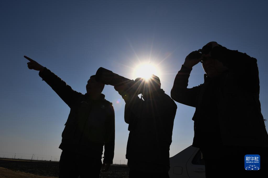 3月28日,在吉林省白城市鎮賚縣濕地,中國野生動物保護協會吉林白城護飛隊隊員王凱(左)、姜海濤(中)和劉聰觀察、拍攝候鳥遷徙。