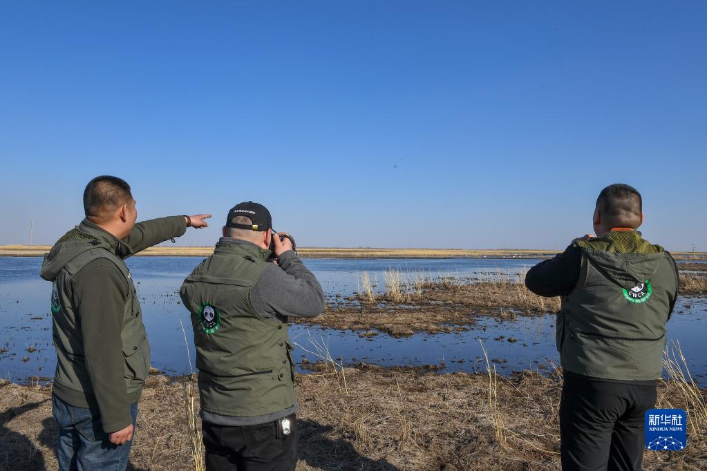 3月28日,在吉林省白城市鎮賚縣濕地,中國野生動物保護協會吉林白城護飛隊隊員王凱(左)、姜海濤(中)和劉聰觀察、拍攝候鳥遷徙路線。
