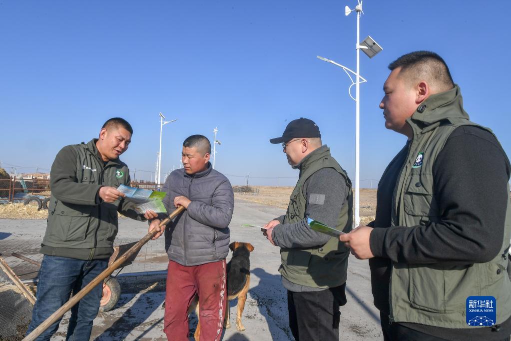 3月28日,在吉林省白城市鎮賚縣,中國野生動物保護協會吉林白城護飛隊隊員王凱(左一)、姜海濤(右二)和劉聰(右一)向候鳥棲息地附近的農民宣傳野生動物保護知識。