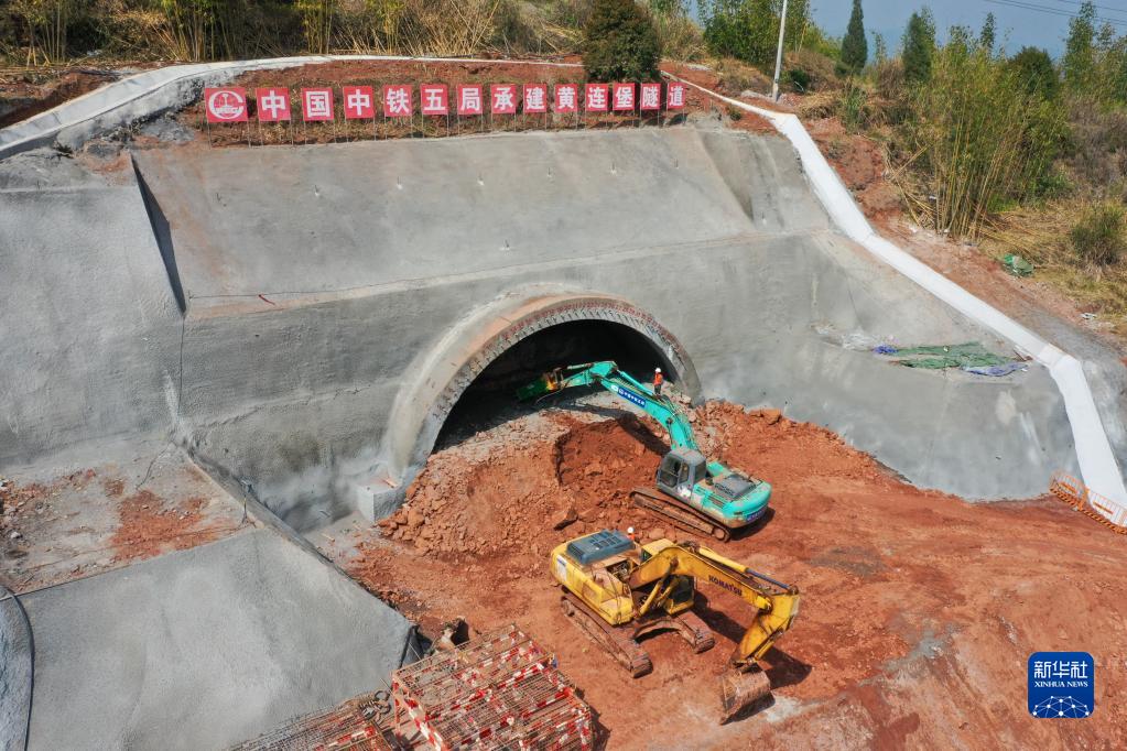 這是3月30日拍攝的位于重慶市大足區國梁鎮的成渝中線高鐵首座隧道——黃連堡隧道施工現場(無人機照片)。