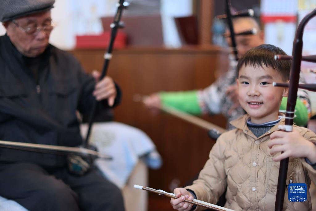 識譜、拉弦樣樣不懂,錢?;奶幱懡?,然后回家摸索練習,慢慢掌握二胡演奏技巧。受他的影響,兒子錢建平也愛上了二胡演奏。生活條件越來越好,孫子錢鈞在女兒錢智嫻5歲時便開始請專業二胡老師授課,父女倆一起學習,共同提高。2019年,錢智嫻獲得第四屆“敦煌杯”中國二胡演奏比賽非職業少年B組金獎。如今,錢鈞7歲的兒子錢智臣以姐姐為榜樣,也開始練習二胡。