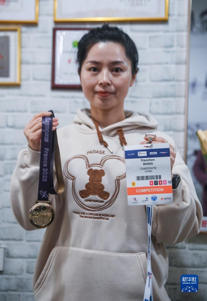 3月30日,在位于杭州市臨平區塘棲鎮的曉珍發藝工作室內,聾啞人王曉珍展示她參加國際殘疾人職業技能競賽的參賽證和贏得的金牌。