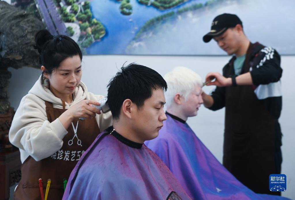 3月30日,聾啞人王曉珍(左一)和丈夫董華良在給盲人門球隊的隊員們義務理發。