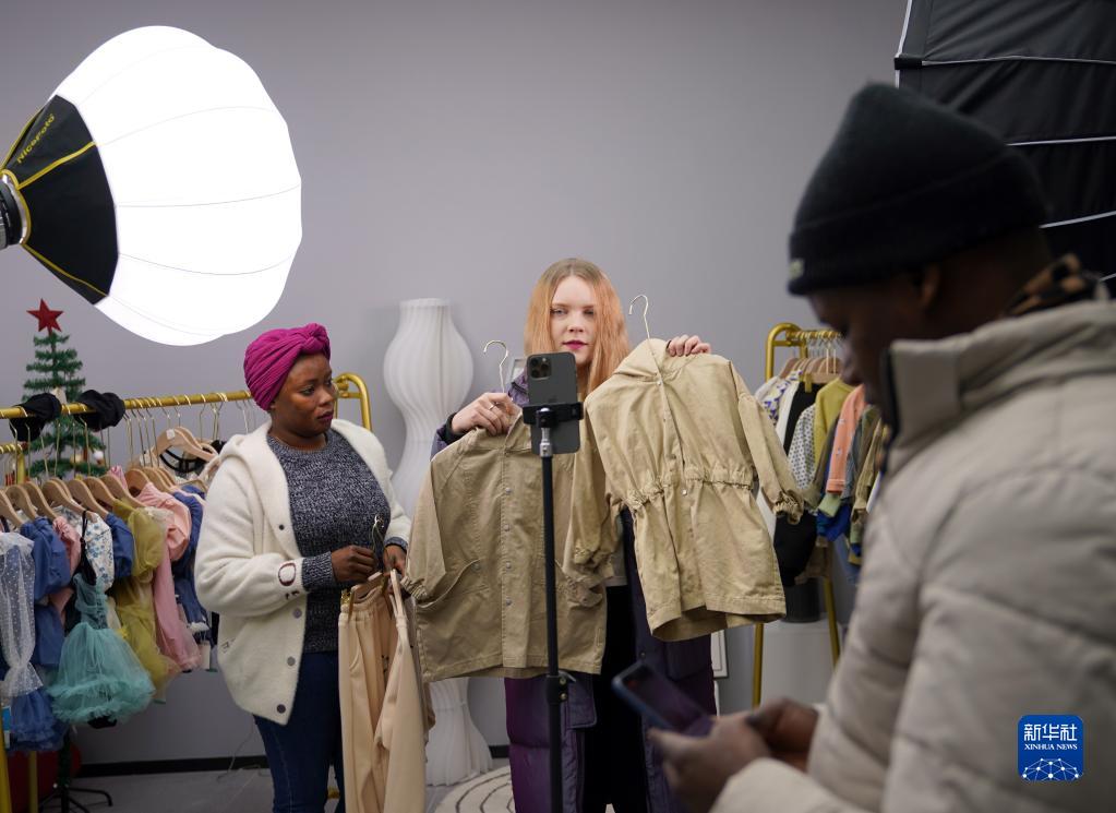 3月30日,在織里象嶼跨境電商產業服務平臺的一個直播間,來自哈薩克斯坦的留學生安娜用母語直播推介織里童裝。