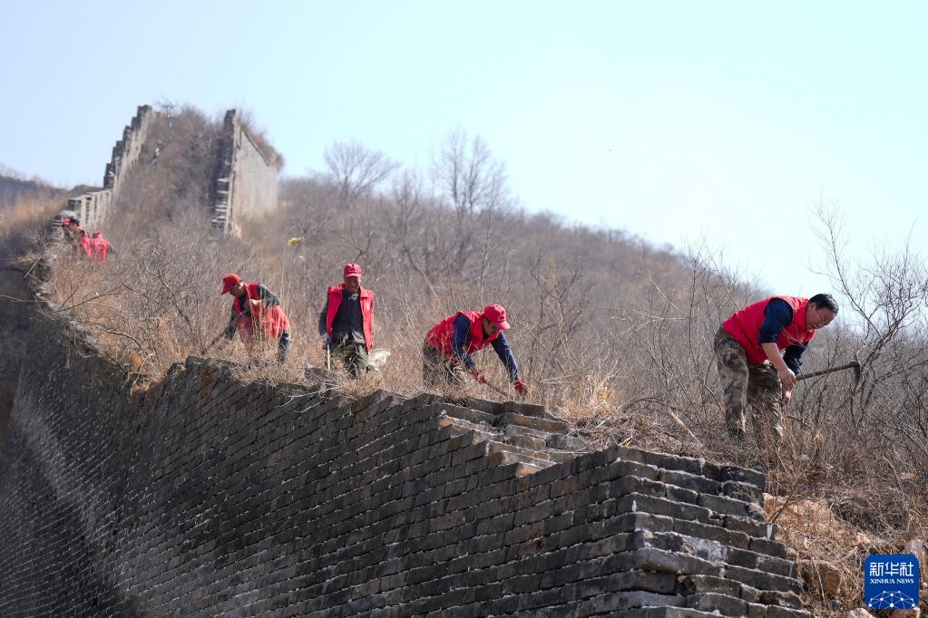3月29日,“洪山口長城保護小分隊”隊員在長城上清理樹枝。