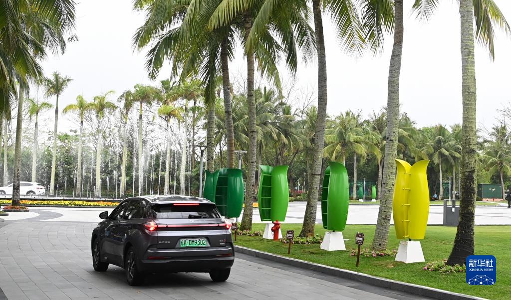 3月28日,新能源車從博鰲亞洲論壇國際會議中心附近的花朵風機前駛過。