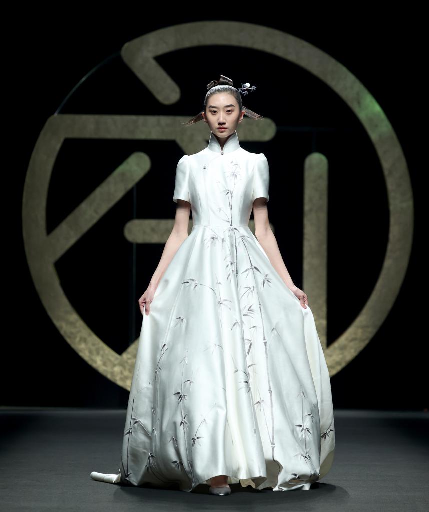 3月30日,在北京舉行的中國國際時裝周2023秋冬系列“六禮·張效奇”時裝發布上,模特展示時裝設計師張效奇設計的時裝。