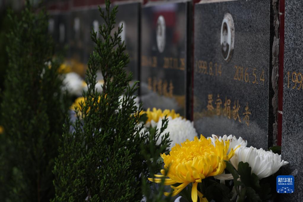 湖南省長沙市鳳凰山遺愛人間公益紀念陵園的遺體和人體器官捐獻者紀念墻前擺滿鮮花(3月30日攝)。