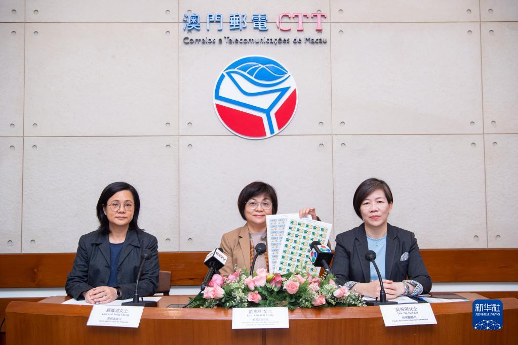 3月30日,澳門郵電局局長劉惠明(中)在新聞發布會上展示“澳門基本法頒布三十周年”郵品。