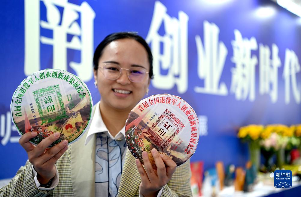 3月30日,首屆全國退役軍人創業創新成果展交會現場,一名參展人員展示為展會特制的紀念茶餅。