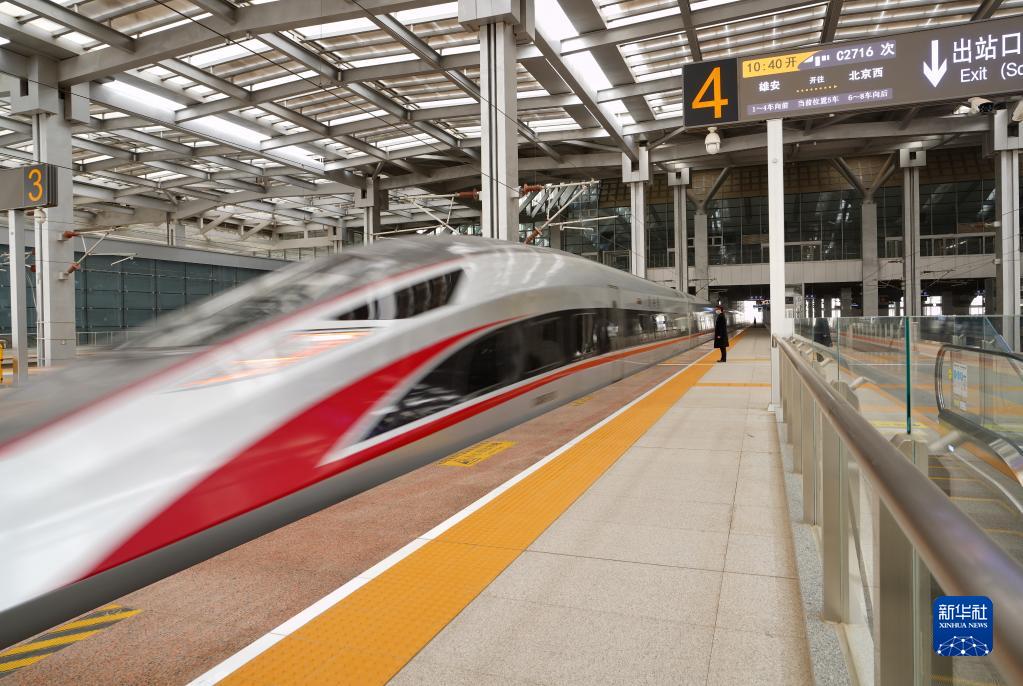 一輛高鐵列車駛離京雄城際鐵路雄安站,開往北京(3月22日攝)。