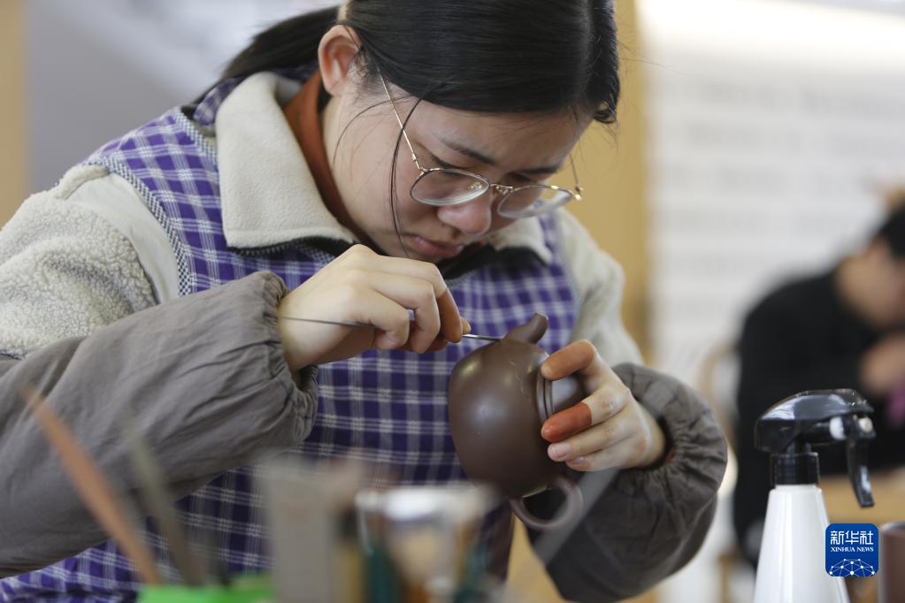 3月30日,社員在江蘇宜興西望紫砂陶瓷專業合作社練習制作紫砂壺。